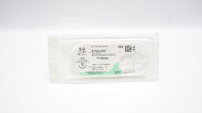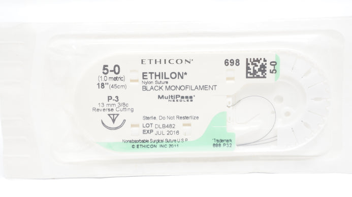 - Ethicon 698 5-0 ETHILON, P-3, 13mm 3/8c Reverse Cutting, 18inch (x)