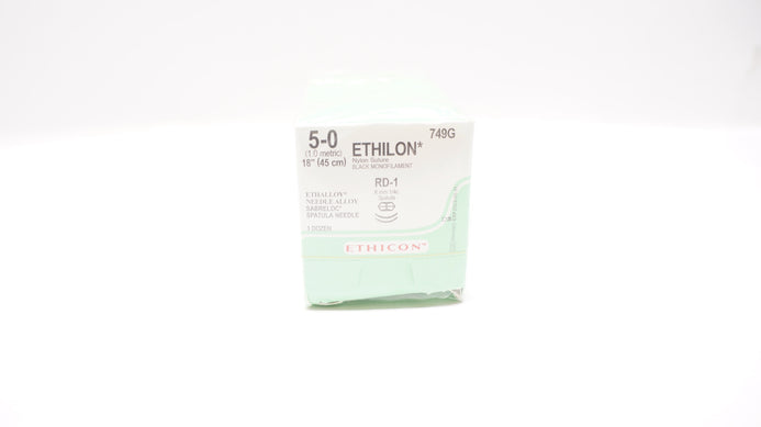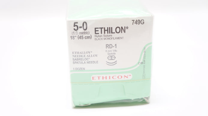- Ethicon 749G 5-0 Ethilon Nylon Stre RD-1 8 mm 1/4c Spatula 18inch(x) - Box of 12