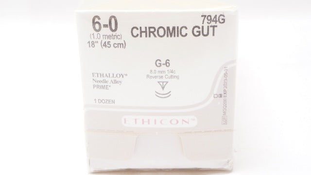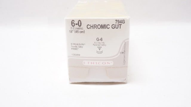 - Ethicon 794G 6-0 CHROMIC GUT, G-6, 8.0mm 1/4c Reverse Cutting,18in - Box of 12
