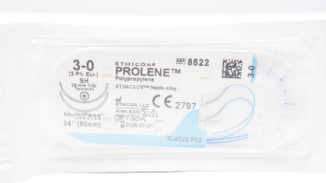 - Ethicon 8522 3-0 PROLENE Polypropylene Stre SH 26mm 1/2c Taperpoint, 36inch