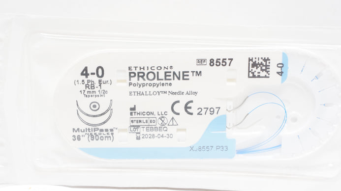 - Ethicon 8557 4-0 Prolene Polypropylene Stre RB-1 17mm 1/2c Taperpoint 36 inch(x)