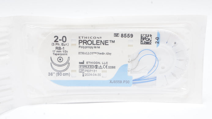 - Ethicon 8559 2-0 Prolene Polypropylene Stre RB-1 17mm 1/2c Taper, 36inch (x)