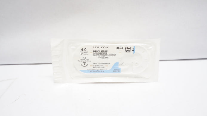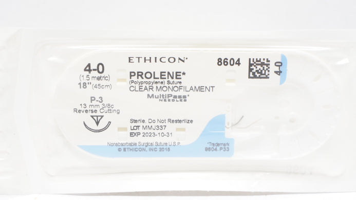 - Ethicon 8604 4-0 Prolene P-3 13mm 3/8c Reverse Cutting 18inch (x)