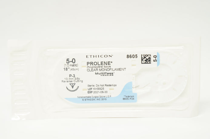 - Ethicon 8605 5-0 PROLENE, P-3 13mm 3/8c Reverse Cutting, 18inch (x)