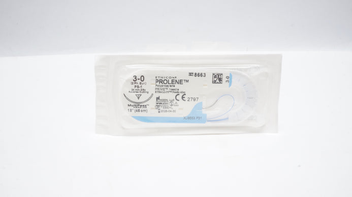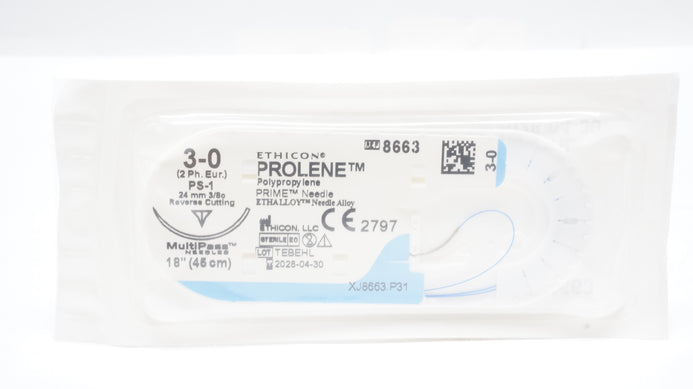 - Ethicon 8663 3-0 Prolene Stre PS-1 24mm 3/8c Reverse Cutting, 18 inch