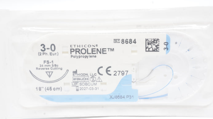- Ethicon 8684 3-0 Prolene Stre FS-1 24mm 3/8c Reverse Cutting 18inch