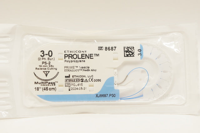 - Ethicon 8687 3-0 PROLENE Stre PS-2 19mm 3/8c Reverse Cutting, 18inch