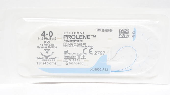 - Ethicon 8699 4-0 PROLENE Polypropylene Stre P-3 13mm 3/8c Reverse Cutting 18inch