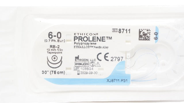 - Ethicon 8711 6-0 PROLENE Polypropylene Stre RB-2 13mm 1/2c Taperpoint 30inch