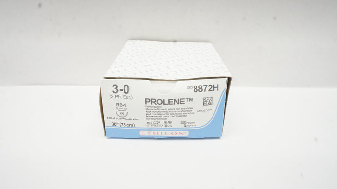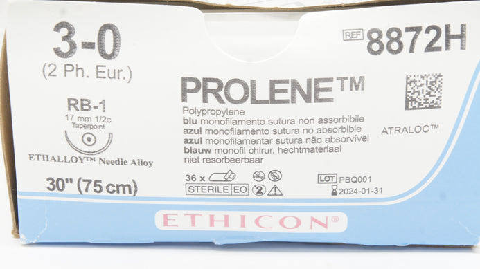 - Ethicon 8872H 3-0 Prolene Polyprolene RB-1 17mm 1/2c,30In - Box of 34 (x)