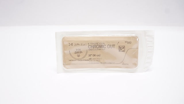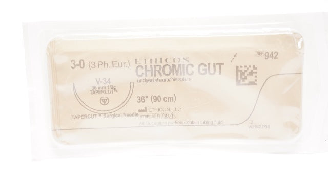 - Ethicon 942 3-0 CHROMIC GUT, V-34, 36mm 1/2c Taper, 36inch (x)