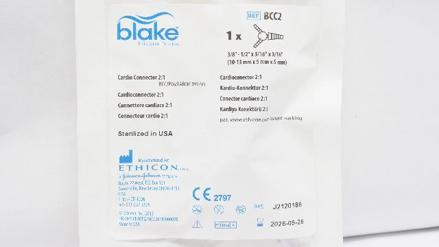 - Ethicon BCC2 Blake Silicone Drains Cardio Connector 2:1 3/8-1/2x3/16x3/16in