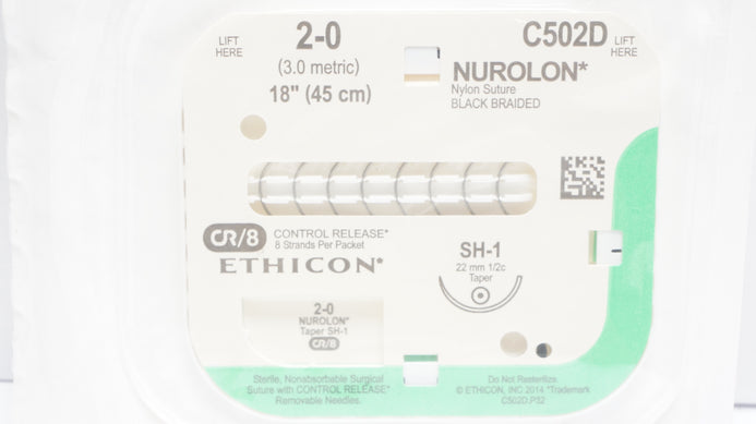 - Ethicon C502D 2-0 Nurolon Nylon Stre Black Braided SH-1 22mm 1/2c Taper 18In (x)