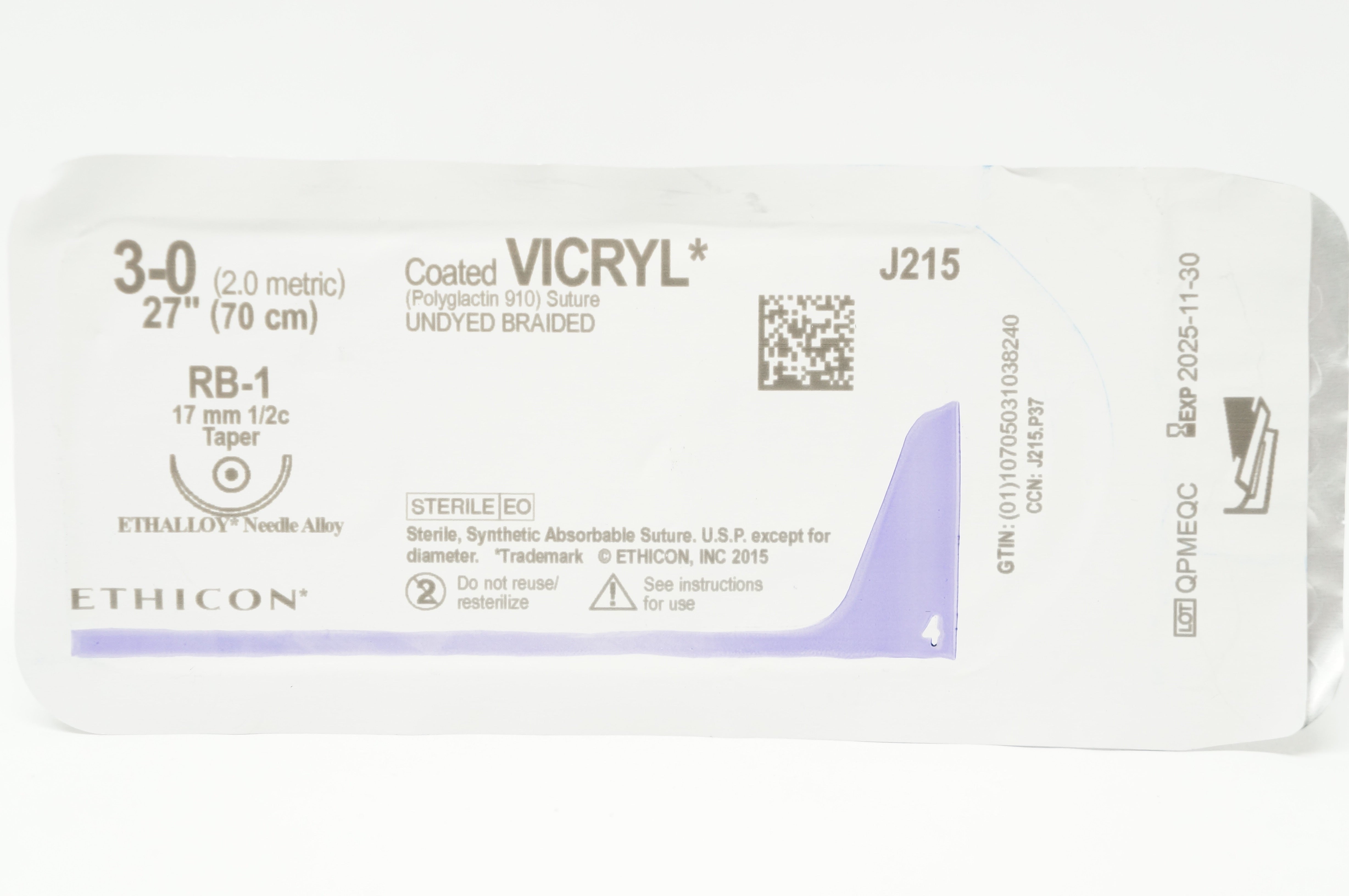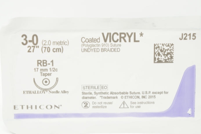 - Ethicon J215 3-0, RB-1 Vicryl 17mm 1/2c Taper, 27inch