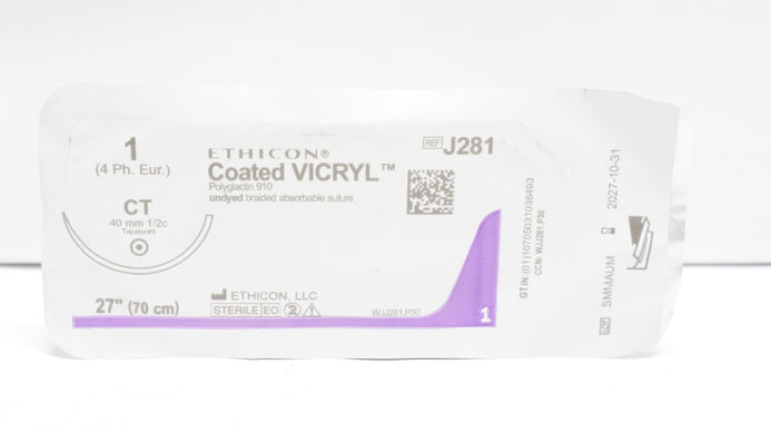 - Ethicon J281 1 Coated VICRYL Polyglactin Stre CT 40mm 1/2c Taperpoint 27inch