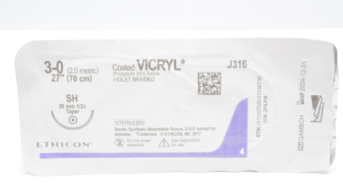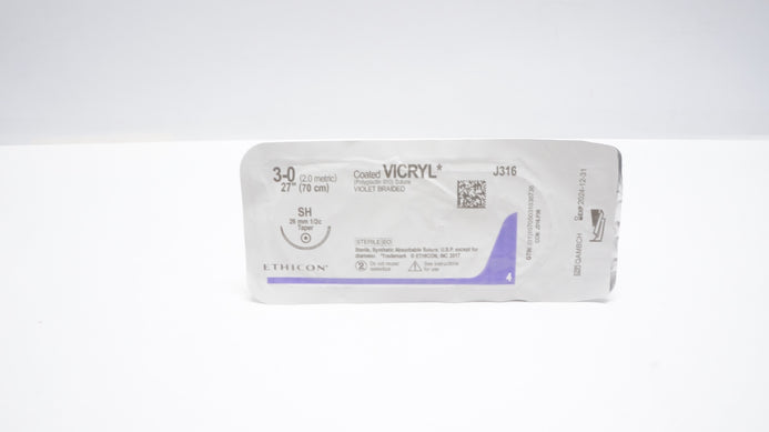 - Ethicon J316 3-0 Coated VICRYL Polyglactin 910 Stre SH 26mm 1/2c Taper 27inch(x)