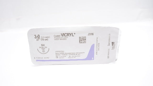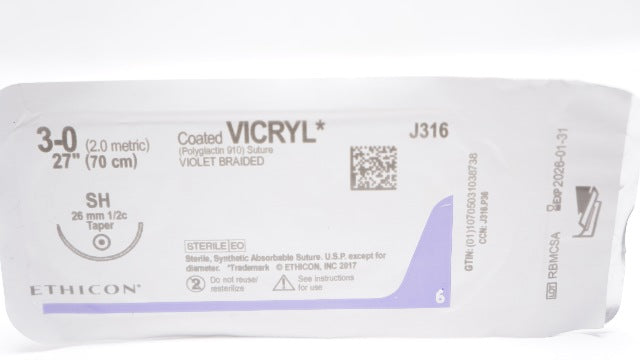 - Ethicon J316 3-0 Coated VICRYL Polyglactin Stre SH 26mm 1/2c Taper, 27inch