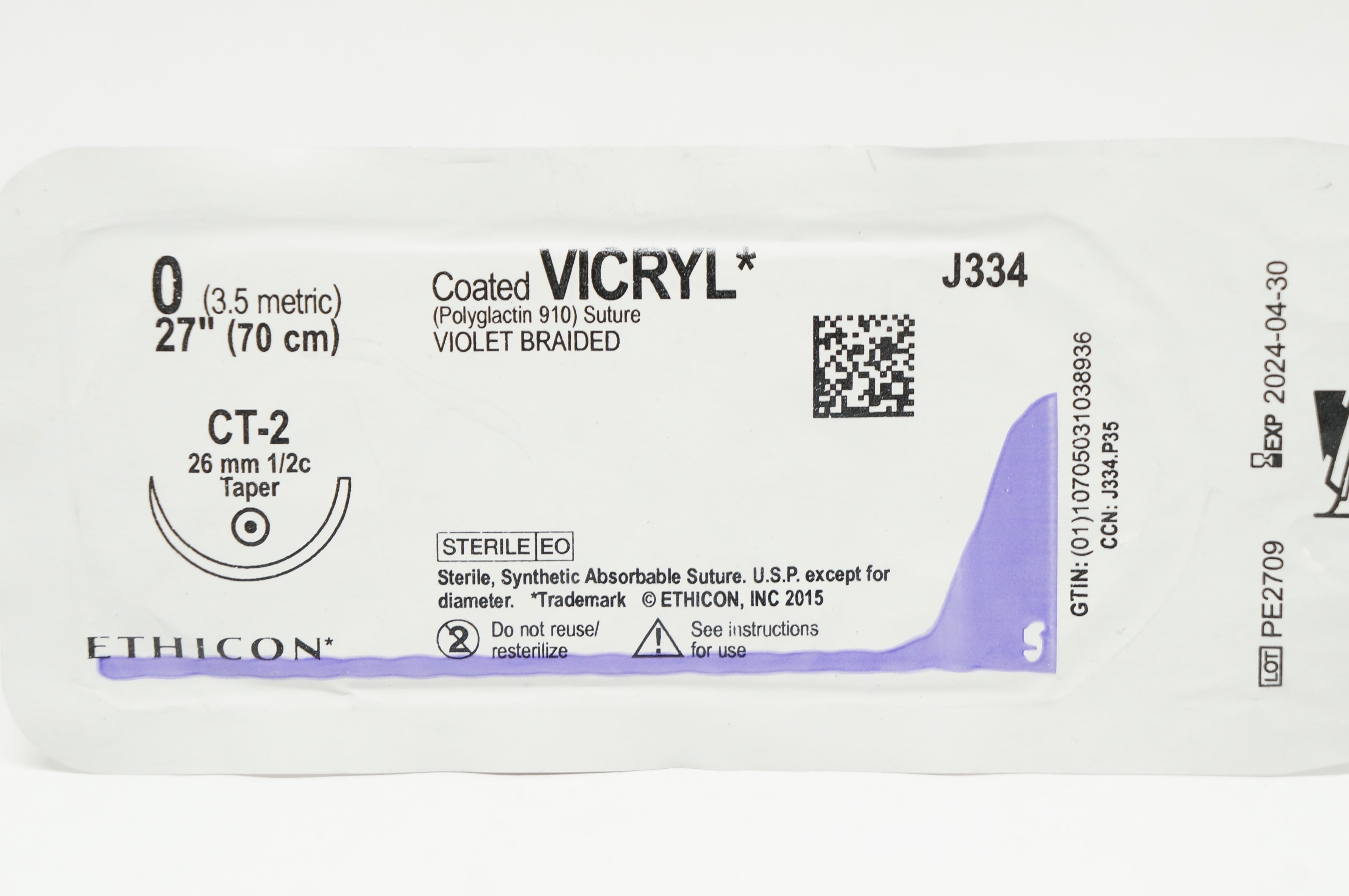 - Ethicon J334 0 Coated VICRYL Polyglactin 910 Stre CT-2, 26mm 1/2c Taper, 27inch