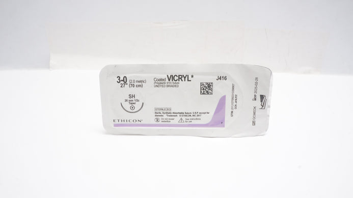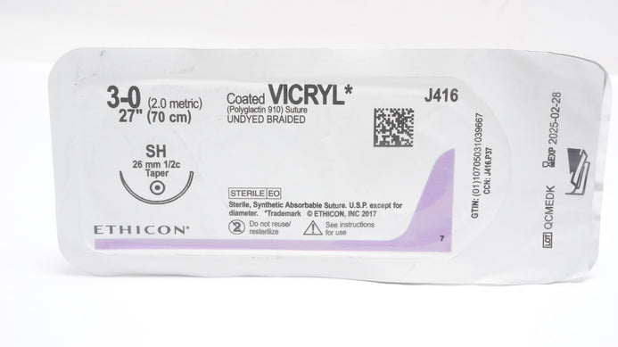 - Ethicon J416 3-0 Coated VICRYL Polyglactin Stre,SH 26mm 1/2c Taperpoint,27in (x)