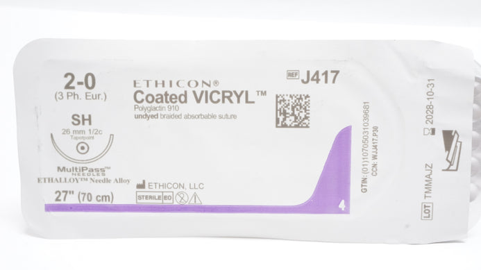- Ethicon J417 2-0 Coated VICRYL Polyglactin Stre SH 26mm 1/2c Taperpoint 27inch