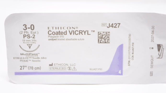 - Ethicon J427 3-0 Coated VICRYL PS-2 19mm 3/8c Reverse Cutting, 27inch