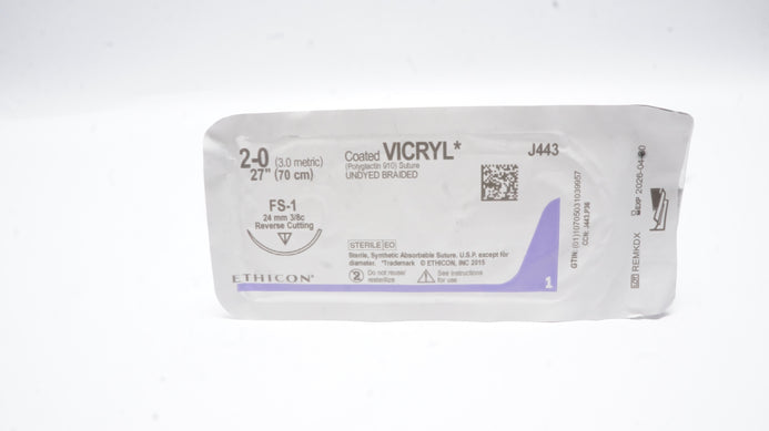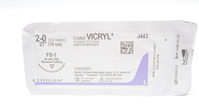 - Ethicon J443 2-0 Coated VICRYL Stre FS-1 24mm 3/8c Reverse Cutting, 27 inch