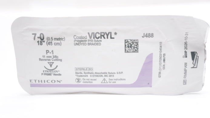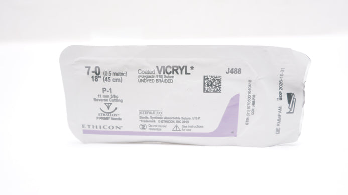 - Ethicon J488 7-0 VICRYL, P-1, 11mm 3/8c Reverse Cutting, 18inch