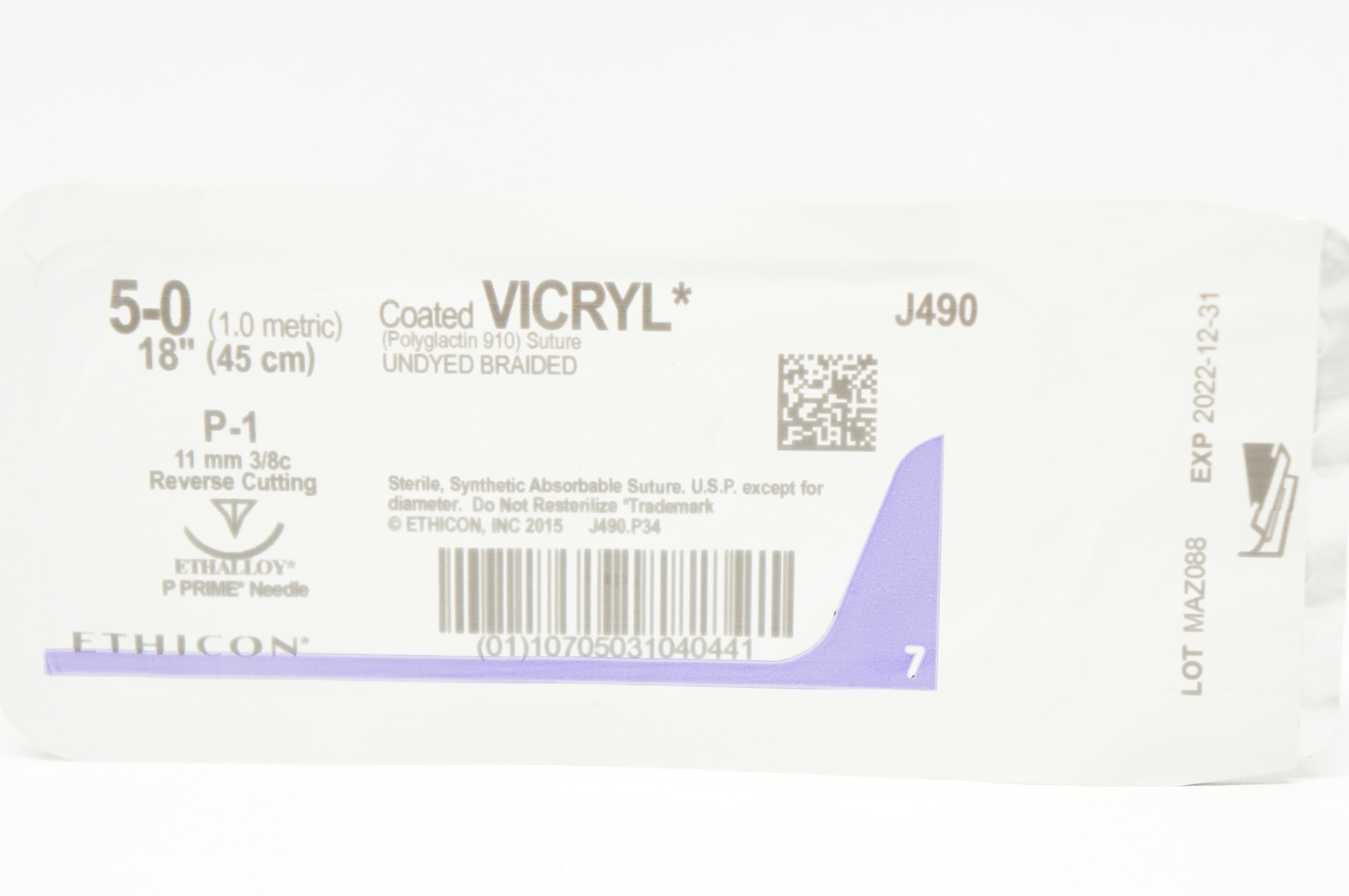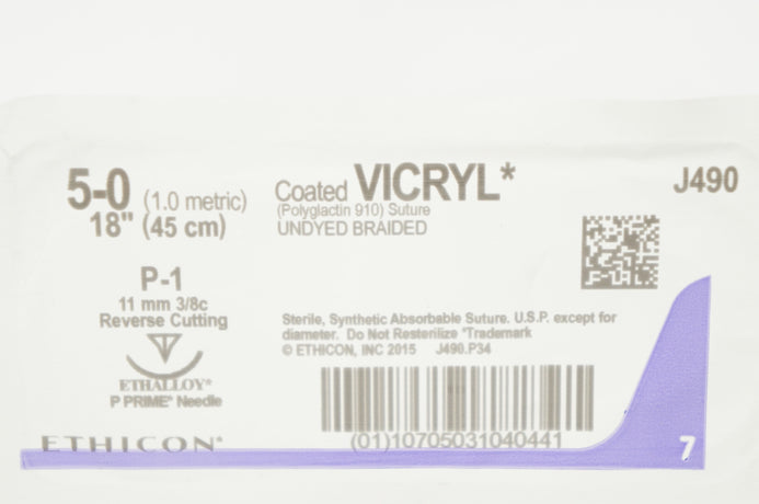- Ethicon J490G 5-0 VICRYL P-1 11mm 3/8c Reverse Cutting 18 inch