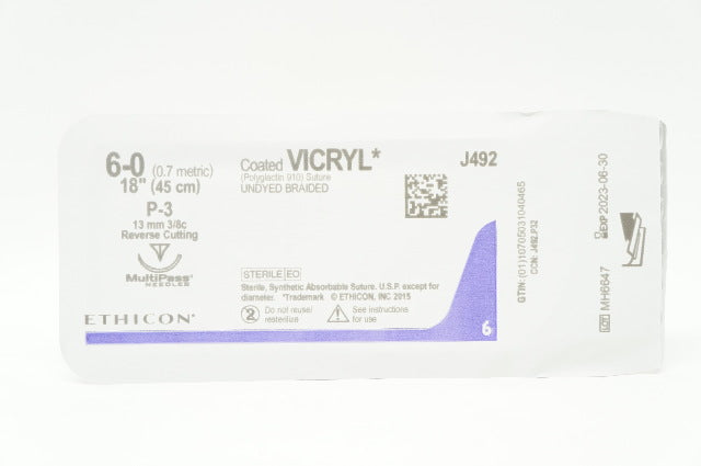 - Ethicon J492 6-0 Coated VICRYL P-3 13mm 3/8c Reverse Cutting, 18inch