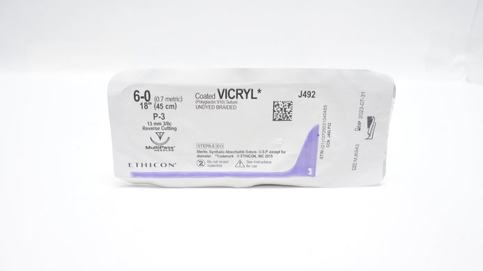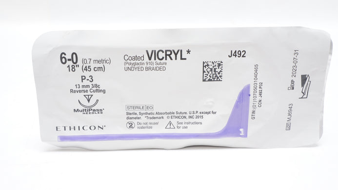 - Ethicon J492 6-0 Coated VICRYL Stre P-3 13mm 3/8c Reverse Cutting 18inch (x)