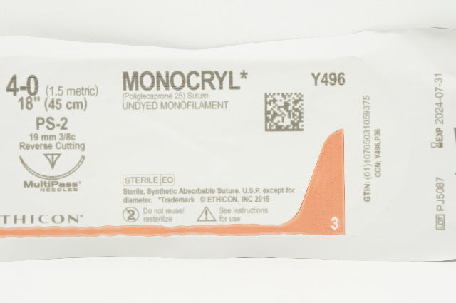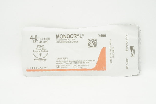 - Ethicon J496 4-0 Monocryl Stre PS-2 19mm 3/8c Reverse Cutting, 18inch