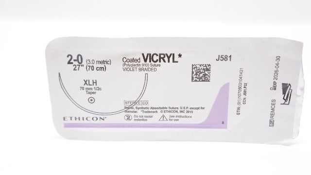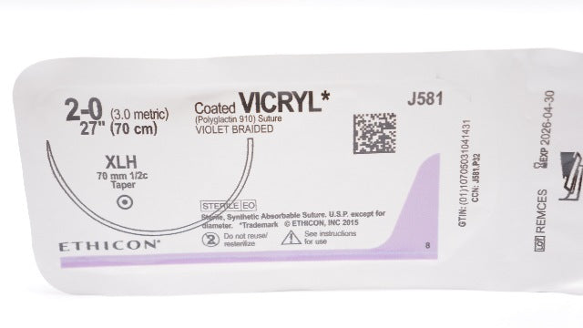 - Ethicon J581 2-0 Coated Vicryl, XLH, 70mm 1/2c Taper, 27inch
