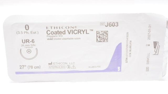 - Ethicon J603 0 Coated VICRYL Braided Stre UR-6, 26mm 5/8c Taperpoint, 27inch