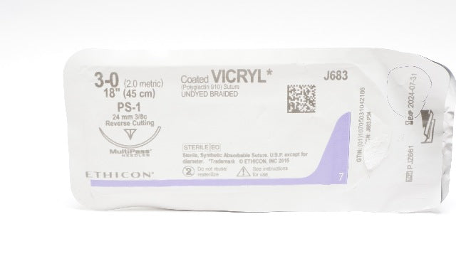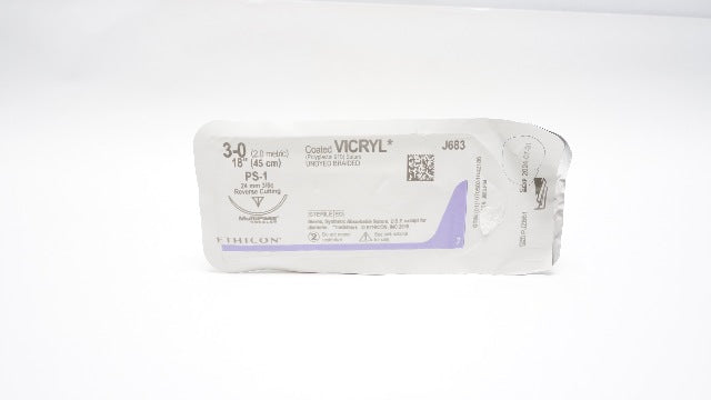 - Ethicon J683 3-0 Coated VICRYL, PS-1, 24mm 3/8c Reverse Cutting, 18inch (x)