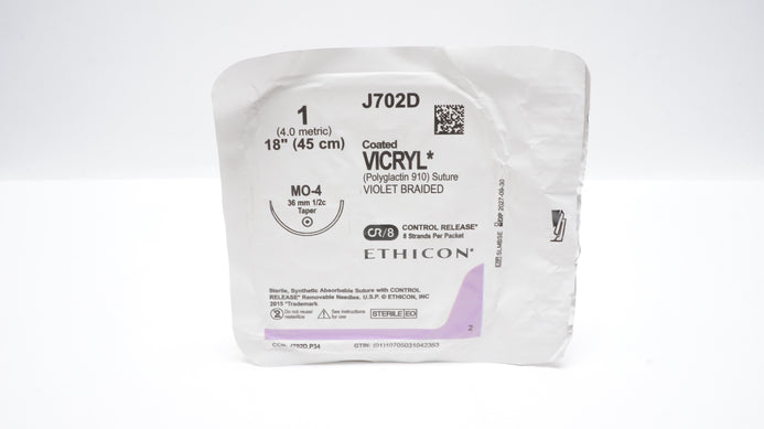 - Ethicon J702D 1 Coated Vicryl Polyglactin Stre MO-4 36mm 1/2c Taper, 18inch