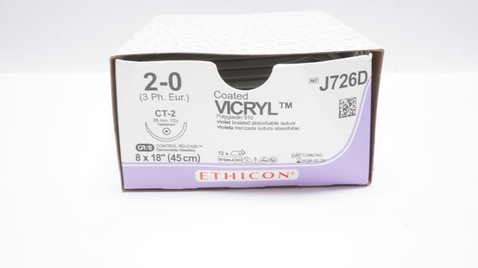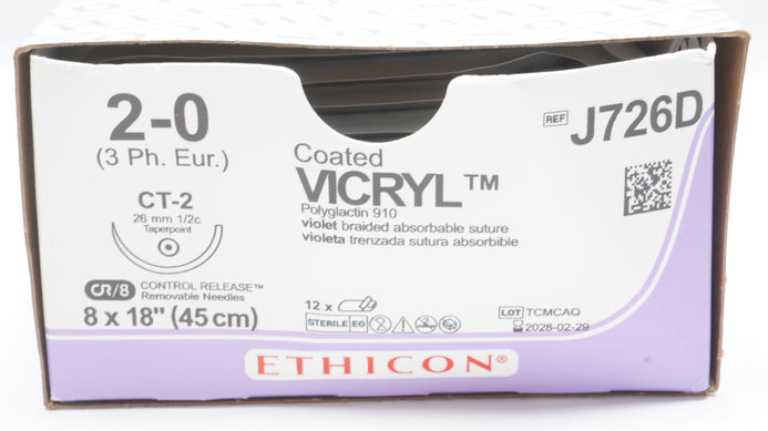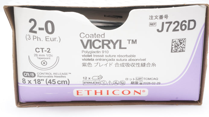 - Ethicon J726D 2-0 Coated VICRYL CT-2 26mm 1/2c Taperpoint, 18inch - Box of 12