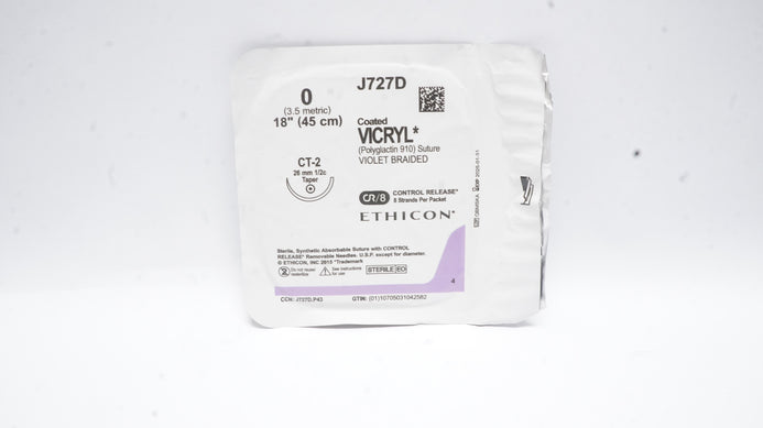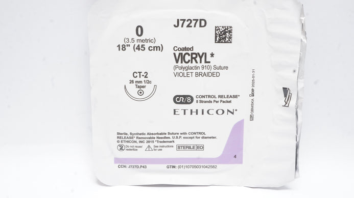- Ethicon J727D 0 Coated VICRYL Polyglactin Stre CT-2 26mm 1/2c Taper, 18inch