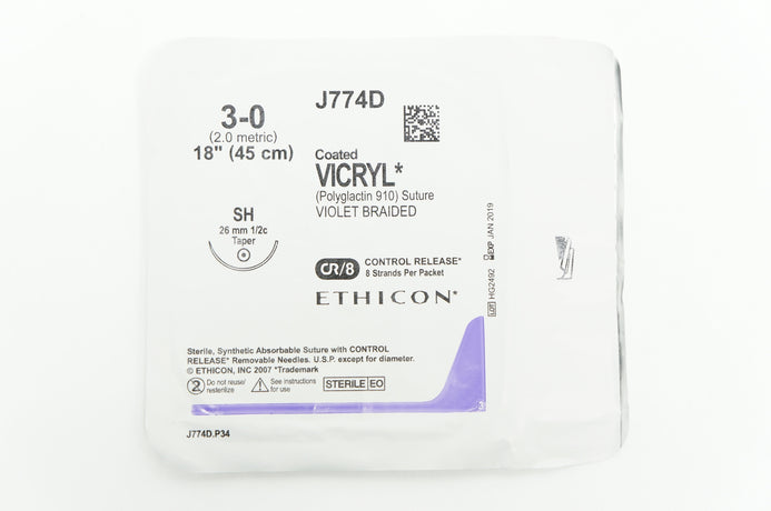 - Ethicon J774D 3-0 Coated VICRYL SH 26mm 1/2c Taper 18in (x)