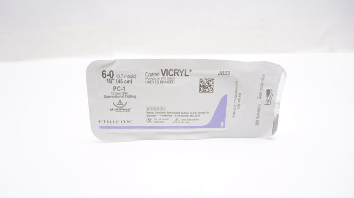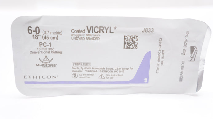 - Ethicon J833 6-0 Coated Vicryl Stre PC-1 13mm 3/8c 18 inch