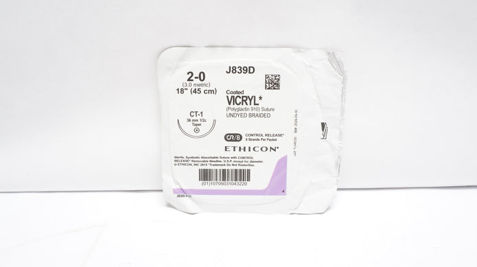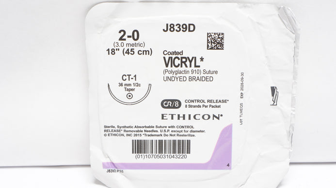 - Ethicon J839D 2-0 Coated VICRYL, CT-1, 36mm 1/2c Taper, 18inch