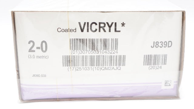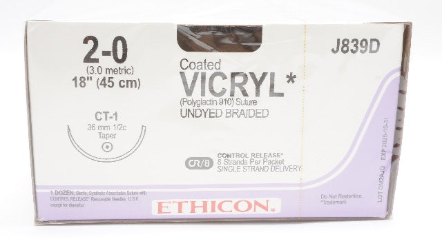 - Ethicon J839D 2-0 Coated VICRYL Stre CT-1 36mm 1/2c Taper, 18 inch - Box of 12