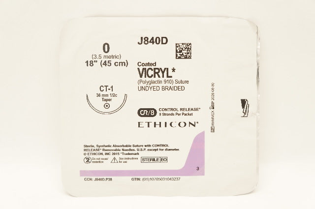 - Ethicon J840D 0 Coated VICRYL Polyglactin 910 Stre CT-1 36mm 1/2c Taper 18inch
