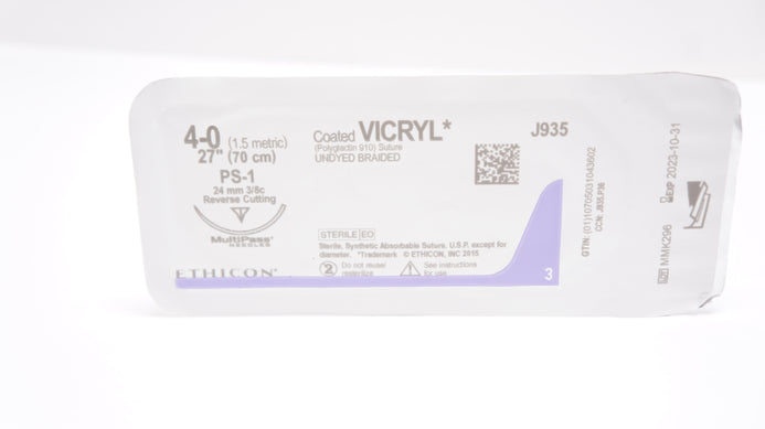 - Ethicon J935 4-0 Coated VICRYL PS-1 24mm 3/8c Reverse Cutting, 27inch (x)