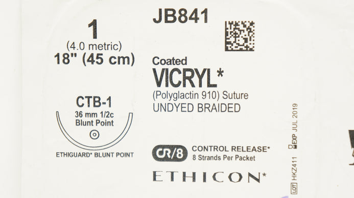 Ethicon JB841 1 Coated VICRYL CTB-1, 36mm 1/2c Ethiguard Needle Blunt Point, 18inch
