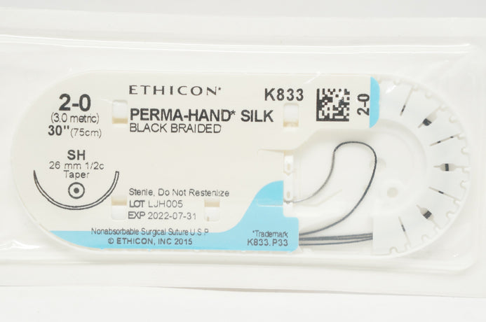 - Ethicon K833 2-0 Perma-Hand Silk Black Braided Stre SH 26mm 1/2c Taper, 30inch (x)