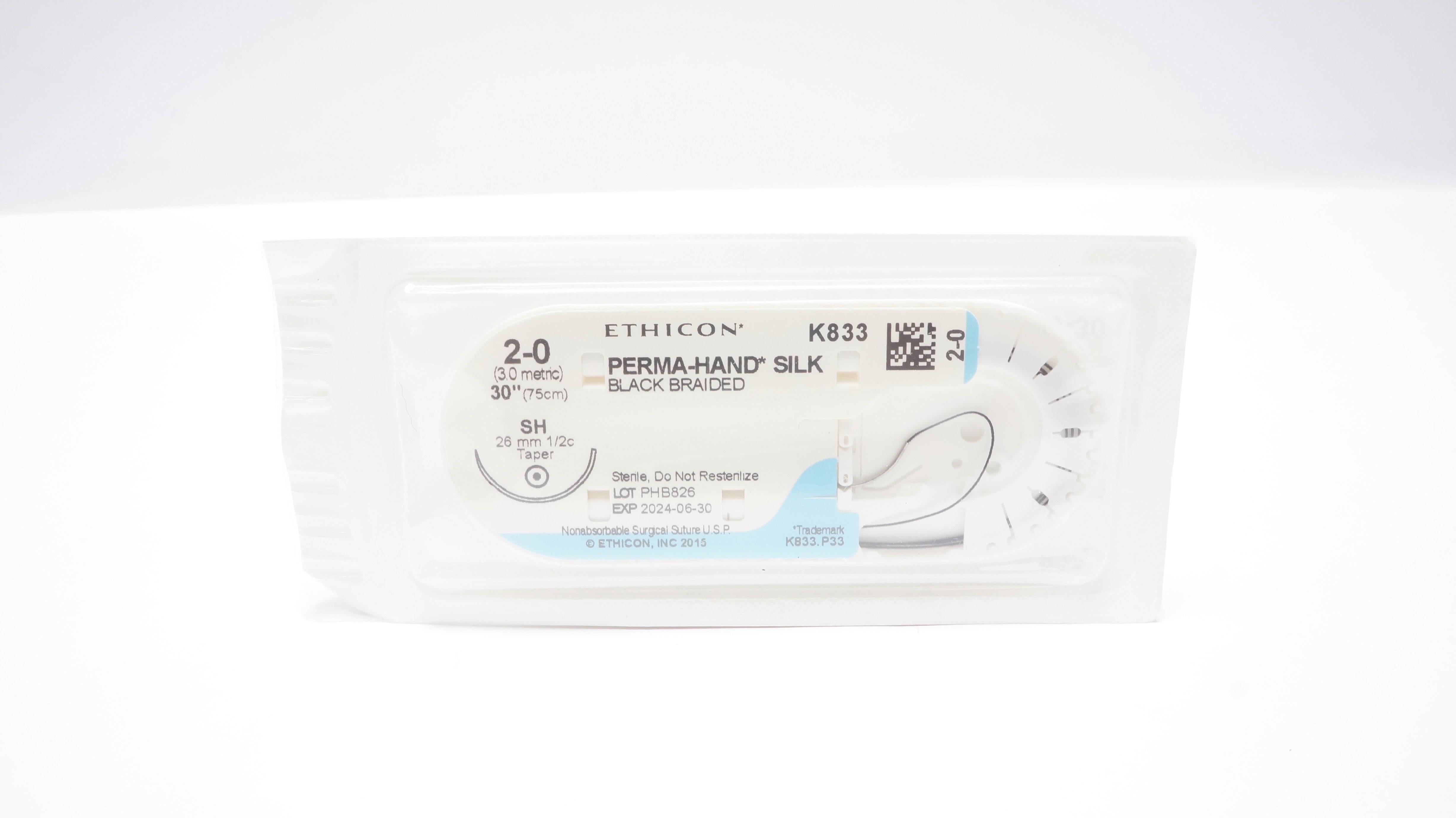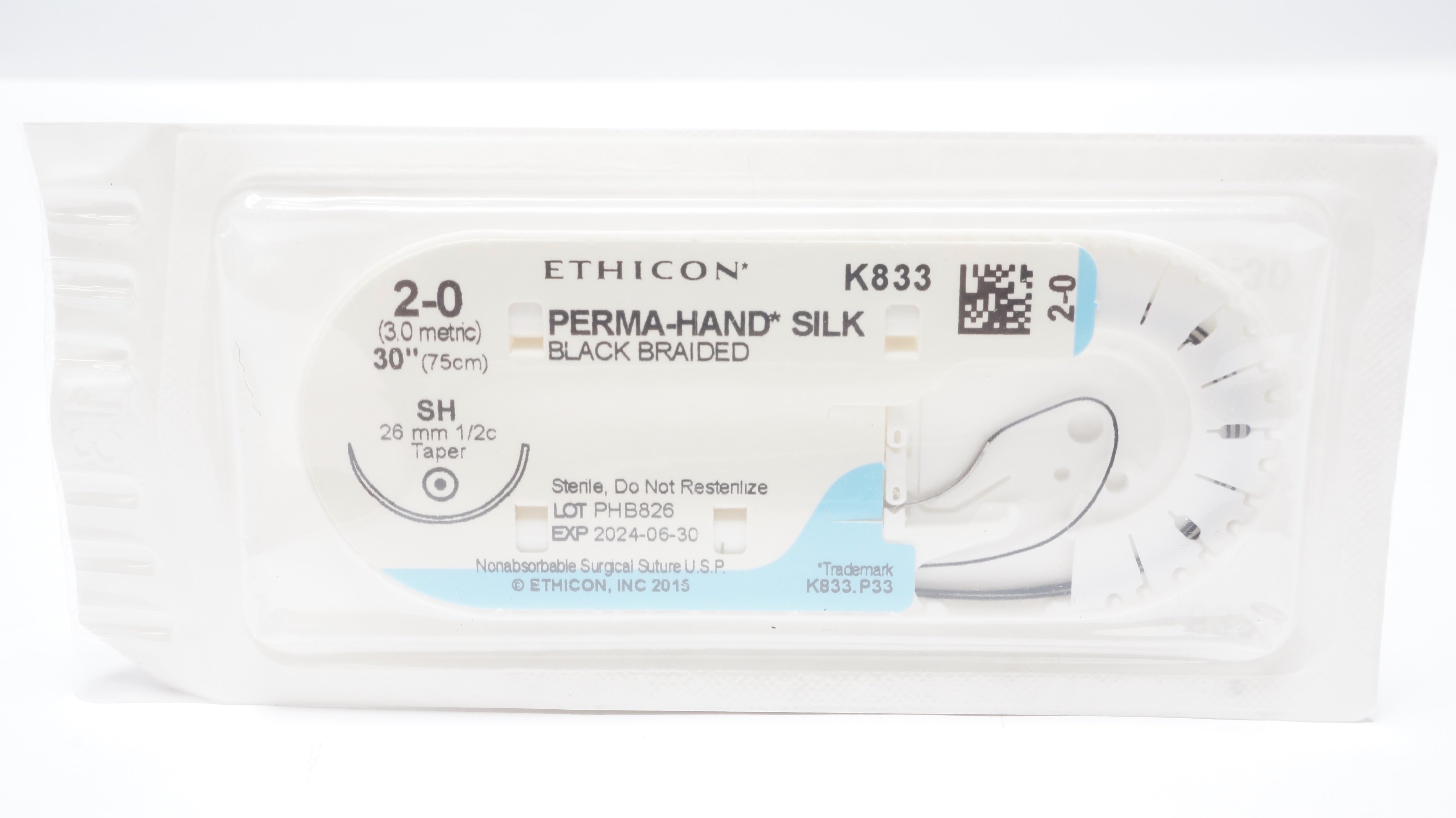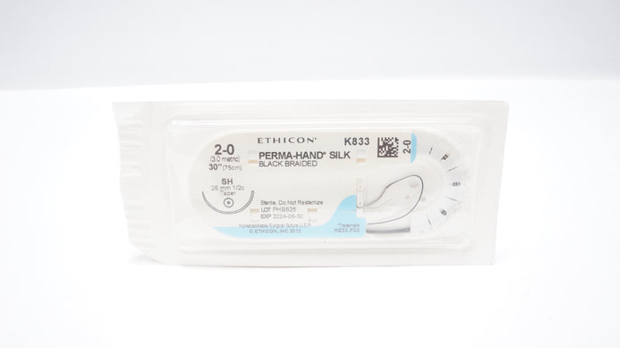 - Ethicon K833 2-0 Perma-Hand Silk Stre SH 26mm 1/2c Taperpoint, 30inch (x)