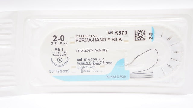 - Ethicon K873 2-0 PERMA-HAND SILK Stre RB-1 17mm 1/2c Taperpoint, 30inch