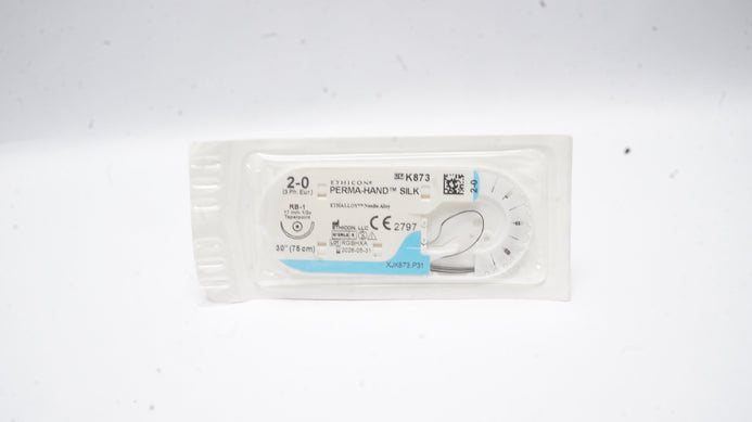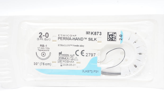 - Ethicon K873 2-0 PERMA-HAND SILK Stre RB-1 17mm 1/2c Taperpoint, 30inch