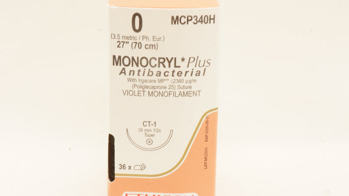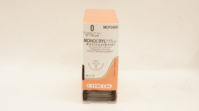 - Ethicon MCP340H 0 Monocryl Plus Antibacterial, CT-1 36mm 1/2c Taper 27inch (x) - Box of 36