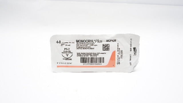 - Ethicon MCP426 4-0 MONOCRYL Plus, PS-2, 19mm 3/8c Reverse Cutting, 27inch (x)
